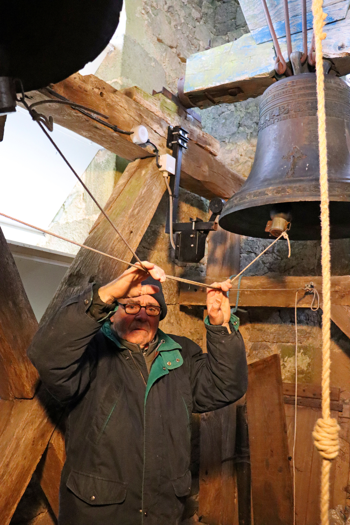 Un royaume dont il est le maître depuis plus de 30 ans, «il n’y a que moi qui ai la clé», précise-t-il. Virevoltant entre les ficelles et les pièces de charpente, Bernard connaît chaque recoin de ce campanile. Avec aisance, il attrape une corde qu’il attache au battant de Joséphine. Il fait de même avec la plus petite cloche. Une fois accroché entre elles, le sonneur tire le milieu des deux liens immaculés. «Et c’est comme ça qu’on va carillonner pour les calendes», s’amuse-t-il, «je vais faire un coup, attention aux oreilles». Pour éviter de devenir sourds, les carillonneurs s’équipent de casques. L’âge faisant son œuvre, Bernard monte avec son fils pour actionner Saint-Pierre. «On la met debout pour sonner les calendes, elle fait des demi-tours et je n’ai plus assez de force pour la tourner».