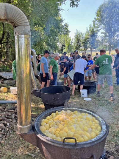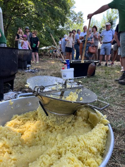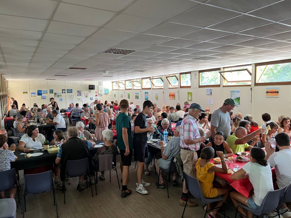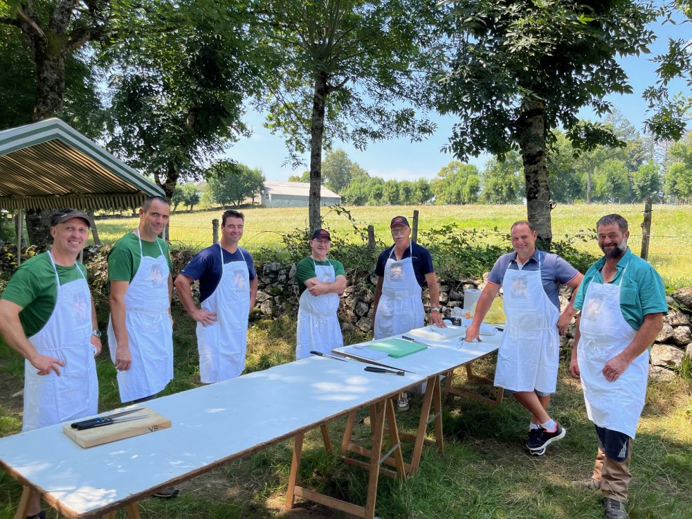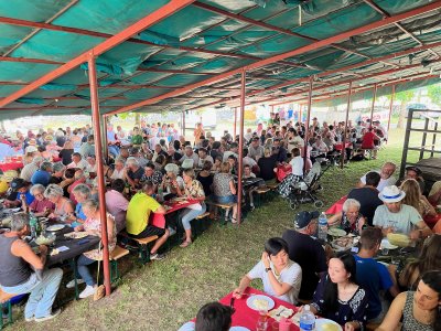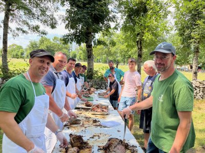 Pour assurer les 400 repas, ce ne sont pas moins de 200 kilos de pommes de terre, 75 kilos de tome fraîche, 35 litres de crème fraîche et 25 culottes d'agneau (soit 150 kilos de viande), qui ont été nécessaires : encore bravo et merci pour ce merveilleux moment, à l'ombre des tilleuls et des frênes, doucement tempéré par une légère brise.