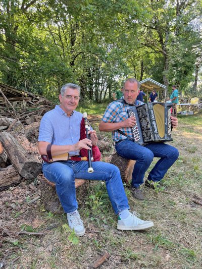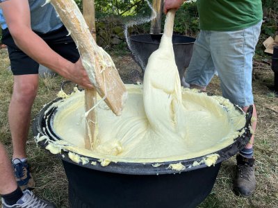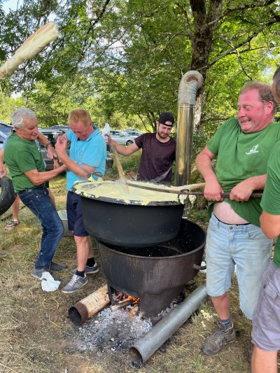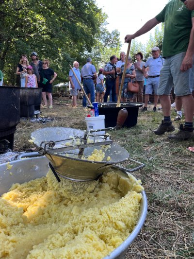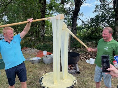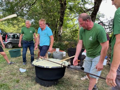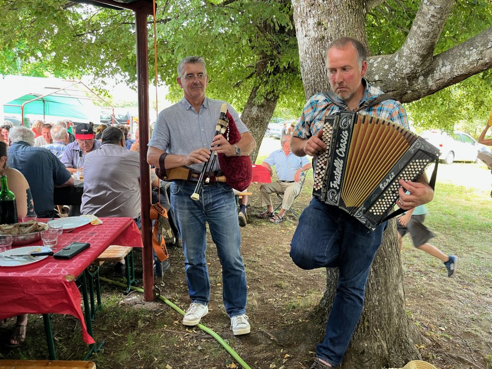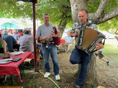 Quant aux estivants, certains se sont essayés à remuer l'aligot, constatant que de bons bras étaient nécessaires. Au son de l'accordéon de Mathieu Puechmaille, d'Alpuech, et de la cabrette de Gilles Cassagnes, du Moulin d'Aval de Graissac, l'ambiance était bonne pour l'apéro puis, une fois à table, pour déguster le melon au porto, suivi du toujours incomparable aligot, et des succulents gigots, à s'en lécher les babines.