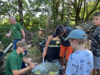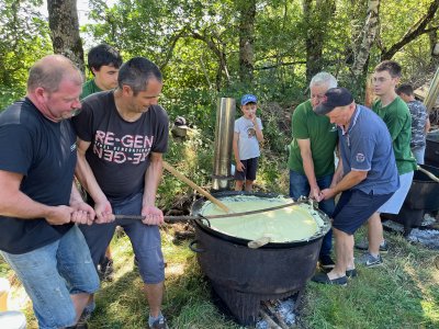 Pour les nouveaux venus, pour les touristes, mais également pour les habitués, le passage par le coin “cuisine” est presque obligatoire, ne serait-ce que pour assister au travail des cuisiniers d'un jour, et bien entendu pour les saluer, observer la manutention mise en œuvre pour chauffer et déplacer, en tracteur, les gamelles d'aligot, après l'avoir tourné à la pelle. Une opération à laquelle on fait participer les convives qui le souhaitent : par forte chaleur comme c'était le cas le 11 août, c'est une suée garantie, même si La Bastide, sur le rebord du plateau, bénéficie d'une ventilation naturelle bienvenue.