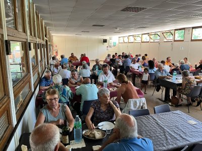 Ensuite, après un passage par la buvette, frênes et tilleuls entourant la salle des fêtes Marcel Lautard, auxquels s'ajoutent des bâches formant chapiteau, procurent l'ombre nécessaire à l'assistance, servie à table, où se succèdent melon au banyuls, aligot et agneau à la couenne doucement grillée par une cuisson lente qui vaut toutes les étoiles du Michelin, au son de l'accordéon...